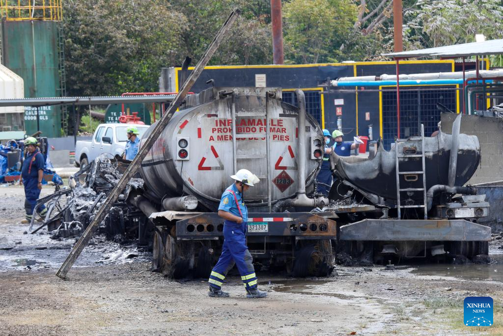 Bomberos inspeccionan el sitio de un incendio provocado por la explosión de un camión cisterna, en la Ciudad de Panamá, capital de Panamá, el 7 de abril de 2026. La explosión de un camión cisterna en Ciudad de Panamá dejó el lunes una persona muerta y varias otras heridas, informaron las autoridades. (Xinhua/Daniel González)