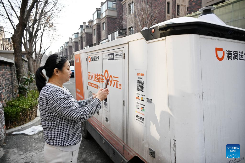 QINGDAO, 7 abril, 2026 (Xinhua) -- Imagen del 28 de enero de 2026 de Zhou Li escaneando un código QR con su teléfono móvil para recoger su pedido entregado por un vehículo de entrega no tripulado en su complejo residencial, en el distrito de Chengyang, en Qingdao, en la provincia de Shandong, en el este de China. En la ciudad costera de Qingdao, los vehículos de entrega autónomos son ahora una imagen habitual en las calles. (Xinhua/Li Ziheng)