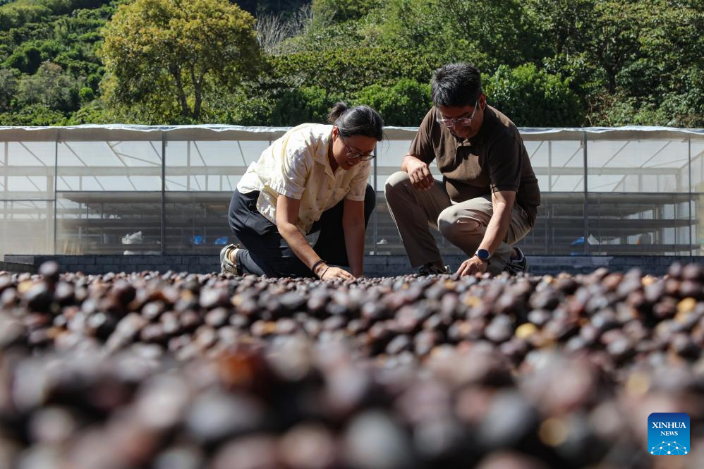 SONSONATE, 13 abril, 2026 (Xinhua) -- Imagen del 29 de marzo de 2026 de la empresaria china, Tong Taohui (i), estudiando la calidad del secado de granos de café junto a su esposo, Hebert Vásquez (d), durante una cata y muestra de grano de café en el beneficio "Los Naranjos", en la municipalidad de Juayúa, en el departamento de Sonsonate, El Salvador. El salvadoreño, Hebert Vásquez, y su esposa, la empresaria china, Tong Taohui, han construido en los últimos años un puente comercial que ahora da un nuevo salto: tras posicionar el café salvadoreño en el mercado chino han creado una empresa para introducir tecnología china especializada en la industria cafetalera y proyectarse hacia Centroamérica. (Xinhua/Alexander Peña)