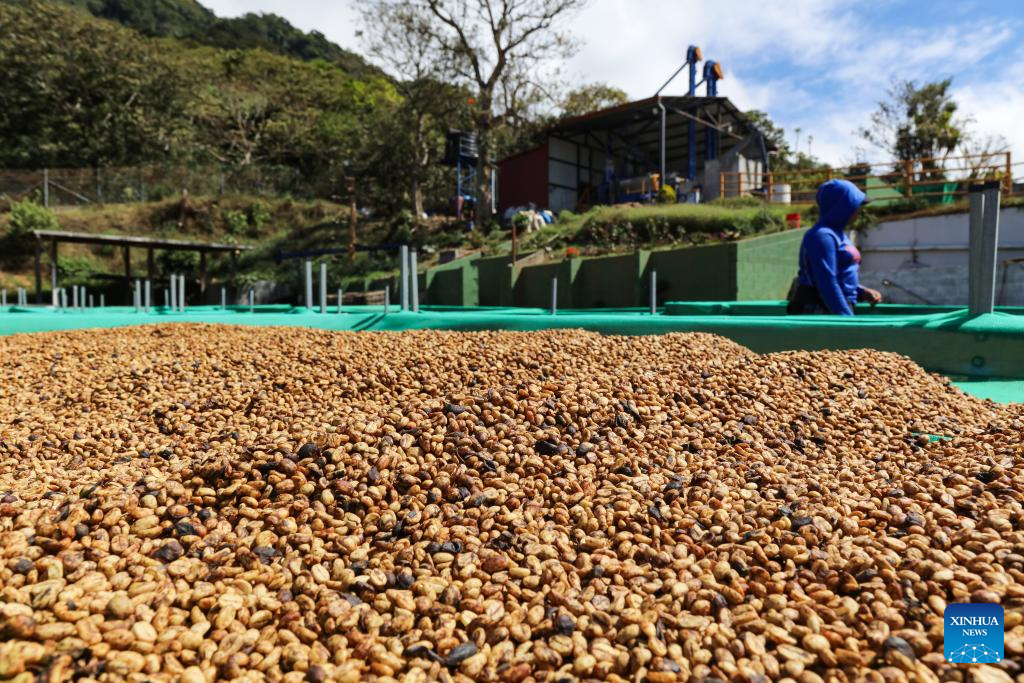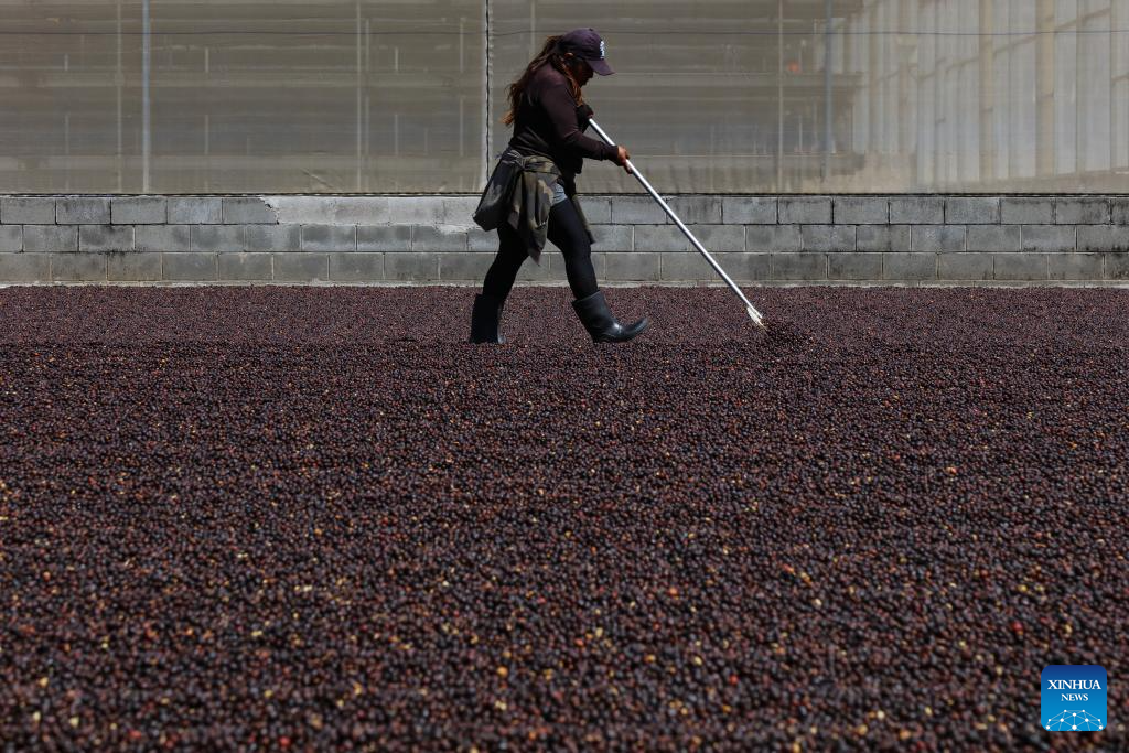 SONSONATE, 13 abril, 2026 (Xinhua) -- Imagen del 29 de marzo de 2026 de una mujer trabajando en los patios de secado de granos de café, durante una cata y muestra de grano de café en el beneficio "Los Naranjos", en la municipalidad de Juayúa, en el departamento de Sonsonate, El Salvador. El salvadoreño, Hebert Vásquez, y su esposa, la empresaria china, Tong Taohui, han construido en los últimos años un puente comercial que ahora da un nuevo salto: tras posicionar el café salvadoreño en el mercado chino han creado una empresa para introducir tecnología china especializada en la industria cafetalera y proyectarse hacia Centroamérica. (Xinhua/Alexander Peña)