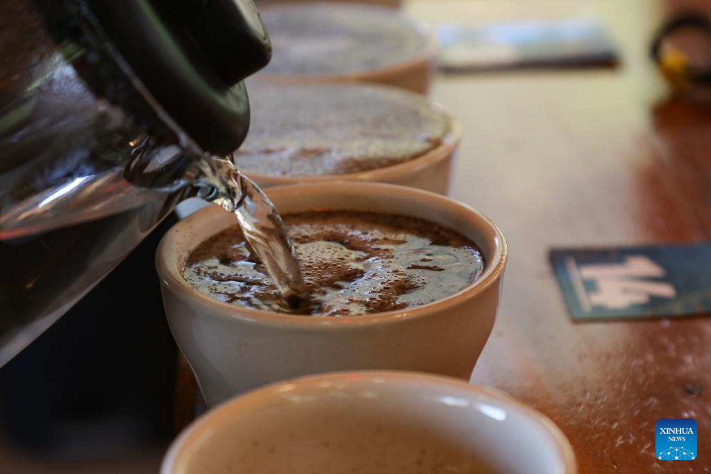 SONSONATE, 13 abril, 2026 (Xinhua) -- Imagen del 29 de marzo de 2026 de una persona preparando una bebida con café, durante una cata y muestra de grano de café en el beneficio "Los Naranjos", en la municipalidad de Juayúa, en el departamento de Sonsonate, El Salvador. El salvadoreño, Hebert Vásquez, y su esposa, la empresaria china, Tong Taohui, han construido en los últimos años un puente comercial que ahora da un nuevo salto: tras posicionar el café salvadoreño en el mercado chino han creado una empresa para introducir tecnología china especializada en la industria cafetalera y proyectarse hacia Centroamérica. (Xinhua/Alexander Peña)