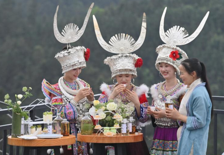 LIUZHOU, 12 abril, 2026 (Xinhua) -- Personas degustan té en una plantación de té, en el distrito autónomo miao de Rongshui de la ciudad de Liuzhou, en la región autónoma zhuang de Guangxi, en el sur de China, el 12 de abril de 2026. (Xinhua/Huang Xiaobang)