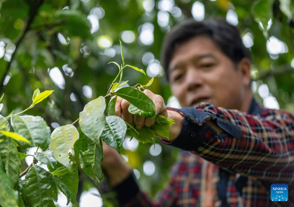 BEIJING, 13 abril, 2026 (Xinhua) -- Imagen del 11 de abril de 2026 de un agricultor de té recolectando brotes de té de un antiguo árbol de té, en la aldea de Chashu del distrito de Nanchuan, en la municipalidad de Chongqing, en el suroeste de China. Los agricultores y las empresas de té están ocupados cosechando y procesando las hojas de té de primavera para satisfacer la demanda de los consumidores en estos días. (Xinhua/Luo Chuan)