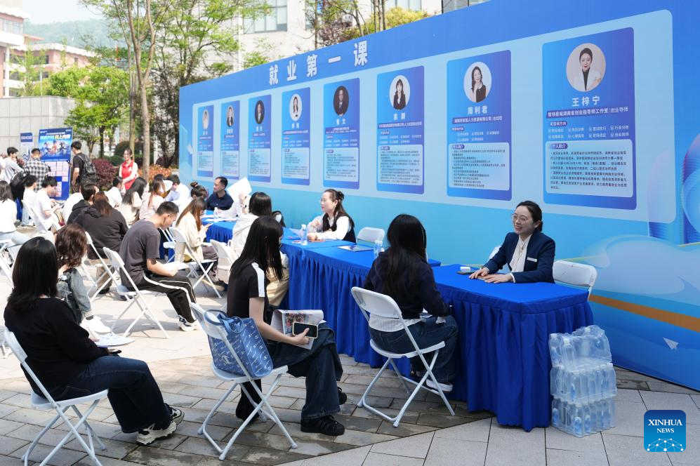 CHANGSHA, 18 abril, 2026 (Xinhua) -- Solicitantes de empleo reciben servicios de consultoría en una feria de empleo celebrada en la Universidad Normal de Hunan, en Changsha, en la provincia de Hunan, en el centro de China, el 18 de abril de 2026. La feria de empleo de dos días para graduados universitarios comenzó el sábado, con las sedes principales en la Universidad de Hunan y la Universidad Normal de Hunan. (Xinhua/Chen Zhenhai)