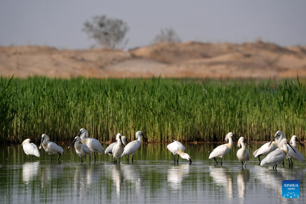 YINCHUAN, 19 abril, 2026 (Xinhua) -- Imagen del 18 de abril de 2026 de espátulas euroasiáticas descansando en el punto escénico de Shahu, en Shizuishan, en la región autónoma hui de Ningxia, en el noroeste de China. (Xinhua/Wang Peng)