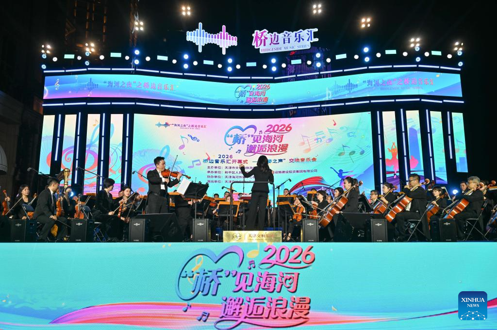 TIANJIN, 19 abril, 2026 (Xinhua) -- Imagen del 18 de abril de 2026 de miembros de la Orquesta Sinfónica de Tianjin realizando una presentación en la Plaza Jinwan a orillas del río Haihe, en Tianjin, en el norte de China. El ciclo de conciertos Serie de Música Junto al Puente dio comienzo aquí el sábado. (Xinhua/Sun Fanyue)