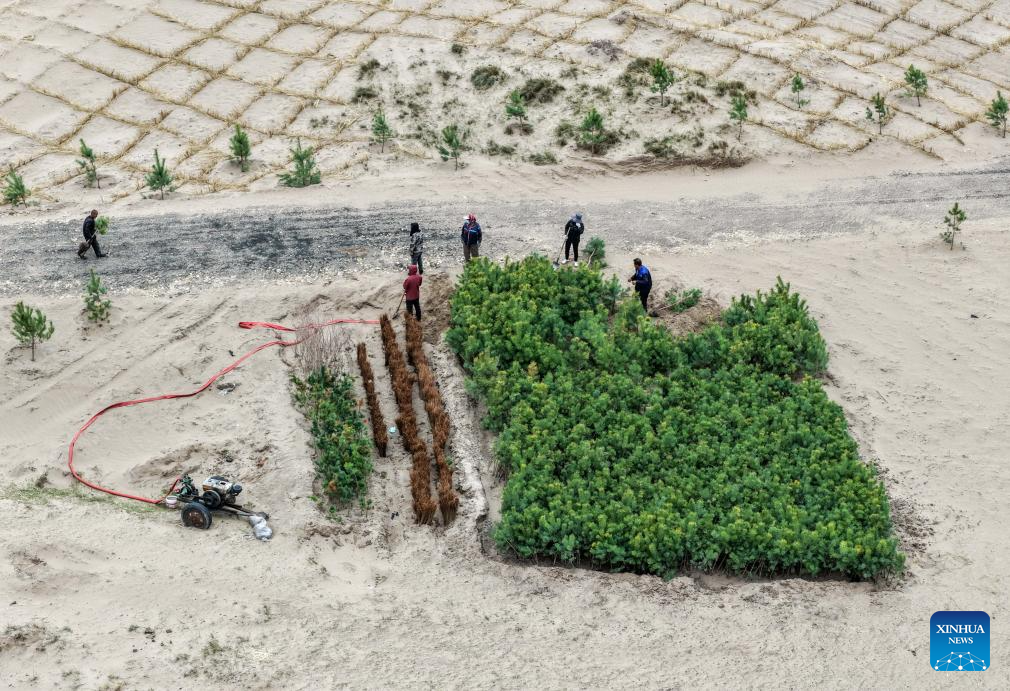 TONGLIAO, 20 abril, 2026 (Xinhua) -- Vista aérea tomada con un dron el 19 de abril de 2026 de trabajadores plantando árboles en el área de un proyecto contra la desertificación, en la bandera trasera del ala izquierda de Horqin de la ciudad de Tongliao, en la región autónoma de Mongolia Interior, en el norte de China. El área arenosa de este proyecto abarca casi 3.000 mu (200 hectáreas), lo que la convierte en la última zona de terreno arenoso móvil y semimóvil que se va a tratar en la bandera trasera del ala izquierda de Horqin. (Xinhua/Lian Zhen)