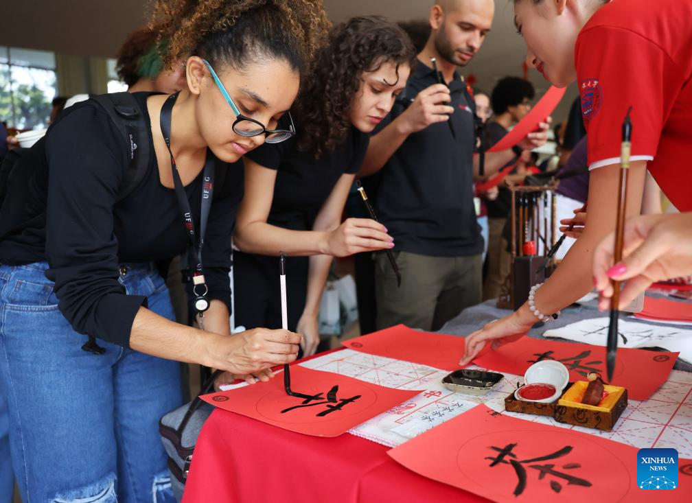 BELO HORIZONTE, 23 abril, 2026 (Xinhua) -- Imagen del 22 de abril de 2026 de estudiantes brasileñas experimentando caligrafía china durante el evento de inauguración de una exposición itinerante titulada "El Sabor que Cruza Montañas y Mares: La Ruta del Té y el Viaje del Café" en la Universidad Federal de Minas Gerais, en Belo Horizonte, Brasil, el 22 de abril de 2026. Como parte de una serie de eventos celebrados durante el "Año Cultural China-Brasil", la exposición itinerante abrió sus puertas aquí el miércoles. (Xinhua/Jin Haoyuan)