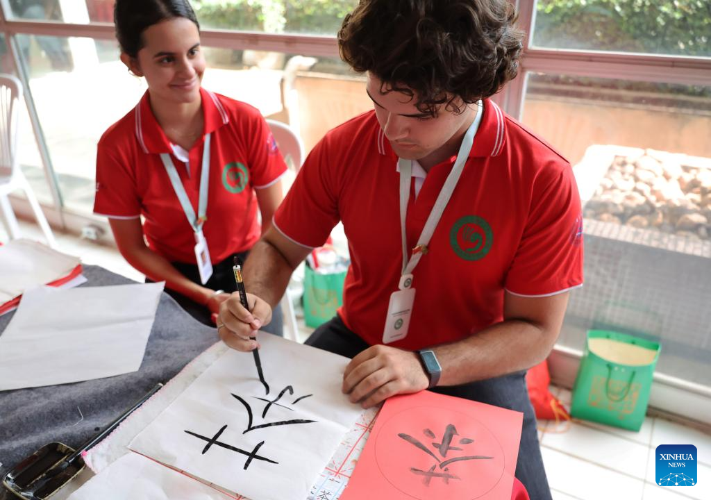 BELO HORIZONTE, 23 abril, 2026 (Xinhua) -- Imagen del 22 de abril de 2026 de un voluntario brasileño experimentando la caligrafía china durante el evento de inauguración de una exposición itinerante titulada "El Sabor que Cruza Montañas y Mares: La Ruta del Té y el Viaje del Café" en la Universidad Federal de Minas Gerais, en Belo Horizonte, Brasil, el 22 de abril de 2026. Como parte de una serie de eventos celebrados durante el "Año Cultural China-Brasil", la exposición itinerante abrió sus puertas aquí el miércoles. (Xinhua/Jin Haoyuan)