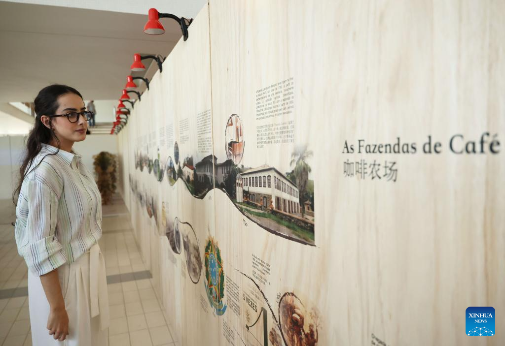 BELO HORIZONTE, 23 abril, 2026 (Xinhua) -- Imagen del 22 de abril de 2026 de una invitada aprendiendo sobre la cultura del café brasileño durante el evento de inauguración de una exposición itinerante titulada "El Sabor que Cruza Montañas y Mares: La Ruta del Té y el Viaje del Café" en la Universidad Federal de Minas Gerais, en Belo Horizonte, Brasil, el 22 de abril de 2026. Como parte de una serie de eventos celebrados durante el "Año Cultural China-Brasil", la exposición itinerante abrió sus puertas aquí el miércoles. (Xinhua/Jin Haoyuan)