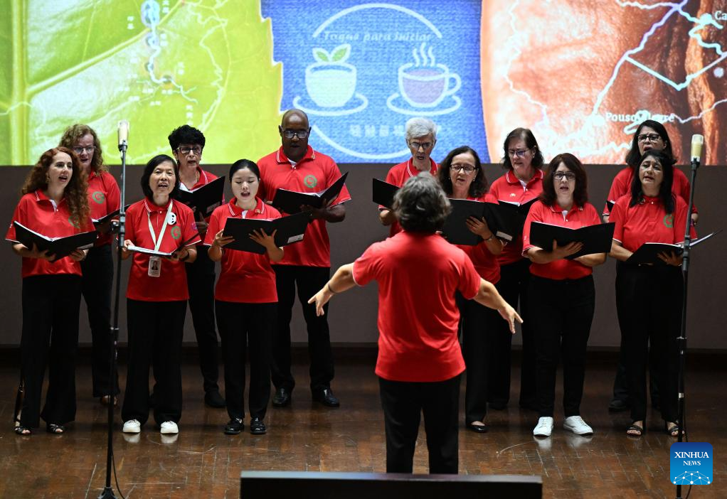 BELO HORIZONTE, 23 abril, 2026 (Xinhua) -- Imagen del 22 de abril de 2026 de intérpretes cantando una canción china durante el evento de inauguración de una exposición itinerante titulada "El Sabor que Cruza Montañas y Mares: La Ruta del Té y el Viaje del Café" en la Universidad Federal de Minas Gerais, en Belo Horizonte, Brasil, el 22 de abril de 2026. Como parte de una serie de eventos celebrados durante el "Año Cultural China-Brasil", la exposición itinerante abrió sus puertas aquí el miércoles. (Xinhua/Jin Haoyuan)