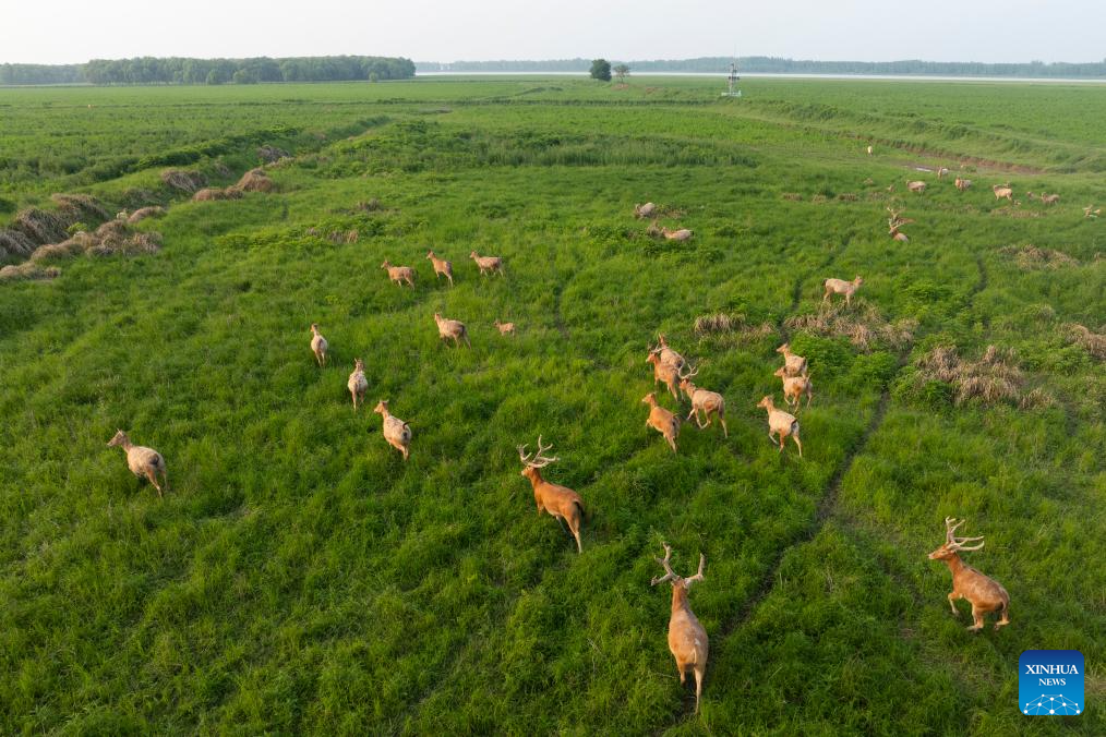 SHISHOU, 24 abril, 2026 (Xinhua) -- Imagen tomada con un dron el 23 de abril de 2026 de ciervos milu en la Reserva Natural Nacional de Ciervos Milú de Shishou, en la provincia de Hubei, en el centro de China. Tras años de esfuerzos por parte de los protectores y la mejora continua del entorno ecológico local, la población de ciervos milú en la reserva natural alcanzó los 2.901 ejemplares a finales de 2025. (Xinhua/Wu Zhizun)