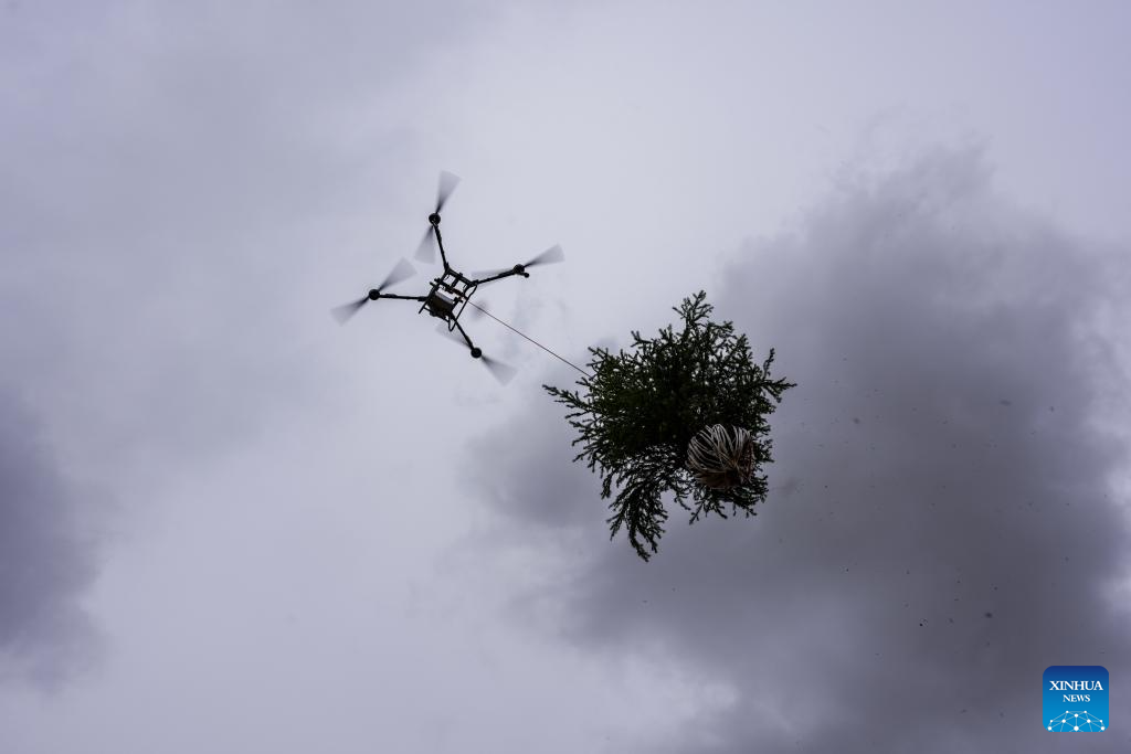 LANZHOU, 28 abril, 2026 (Xinhua) -- Imagen del 27 de abril de 2026 de un dron transportando un árbol joven en un parque, en Lanzhou, en la provincia de Gansu, en el noroeste de China. En los últimos días, varios drones se desplazan de un lado a otro sobre más de 2.300 mu (unas 153 hectáreas) de colinas áridas aquí para levantar con precisión árboles jóvenes y ayudar eficientemente en las operaciones de forestación. (Xinhua/Lang Bingbing)