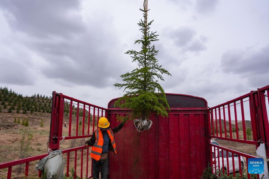 LANZHOU, 28 abril, 2026 (Xinhua) -- Imagen del 27 de abril de 2026 de un dron levantando un árbol joven de un camión en un parque, en Lanzhou, en la provincia de Gansu, en el noroeste de China. En los últimos días, varios drones se desplazan de un lado a otro sobre más de 2.300 mu (unas 153 hectáreas) de colinas áridas aquí para levantar con precisión árboles jóvenes y ayudar eficientemente en las operaciones de forestación. (Xinhua/Lang Bingbing)