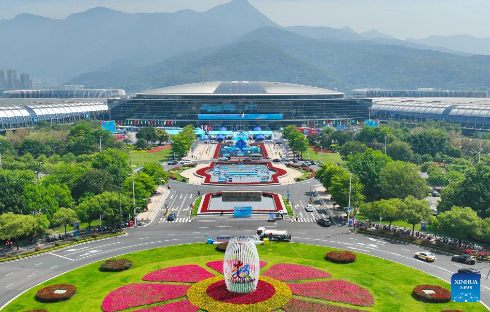 FUZHOU, 28 abril, 2026 (Xinhua) -- Vista aérea tomada con un dron el 28 de abril de 2026 del Centro Internacional de Conferencias y Exposiciones del Estrecho de Fuzhou, en Fuzhou, en la provincia de Fujian, en el sureste de China. El mercado de IA comenzó aquí previo a la IX Cumbre de China Digital que se celebrará en Fuzhou, del 29 al 30 de abril. (Xinhua/Lin Shanchuan)