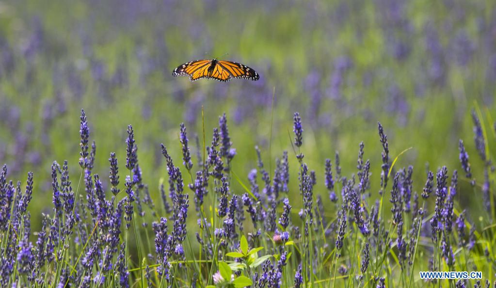 MILTON, 23 julio, 2021 (Xinhua) -- Una mariposa vuela sobre lavandas en la Granja de Lavanda Terre Bleu, en Milton, Ontario, Canadá, el 23 de julio de 2021. (Xinhua/Zou Zheng)