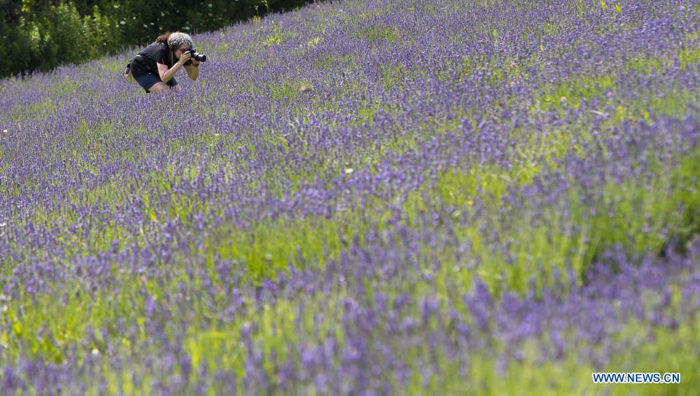 MILTON, 23 julio, 2021 (Xinhua) -- Una mujer toma fotografías de lavandas en la Granja de Lavanda Terre Bleu, en Milton, Ontario, Canadá, el 23 de julio de 2021. (Xinhua/Zou Zheng)