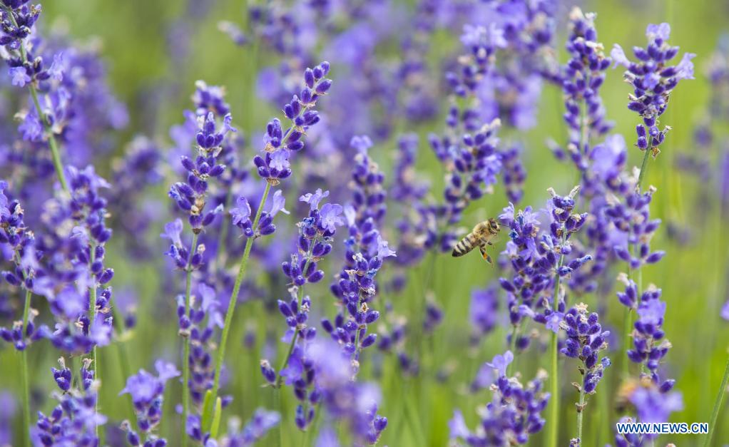 MILTON, 23 julio, 2021 (Xinhua) -- Una abeja de miel vuela entre lavandas en la Granja de Lavanda Terre Bleu, en Milton, Ontario, Canadá, el 23 de julio de 2021. (Xinhua/Zou Zheng)